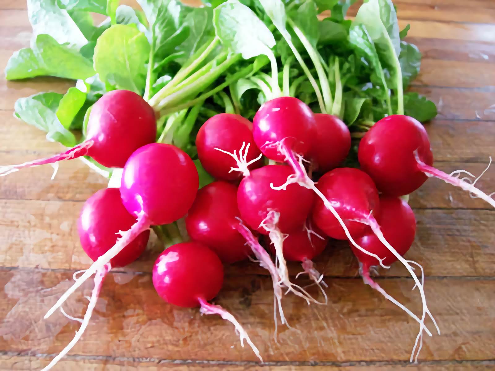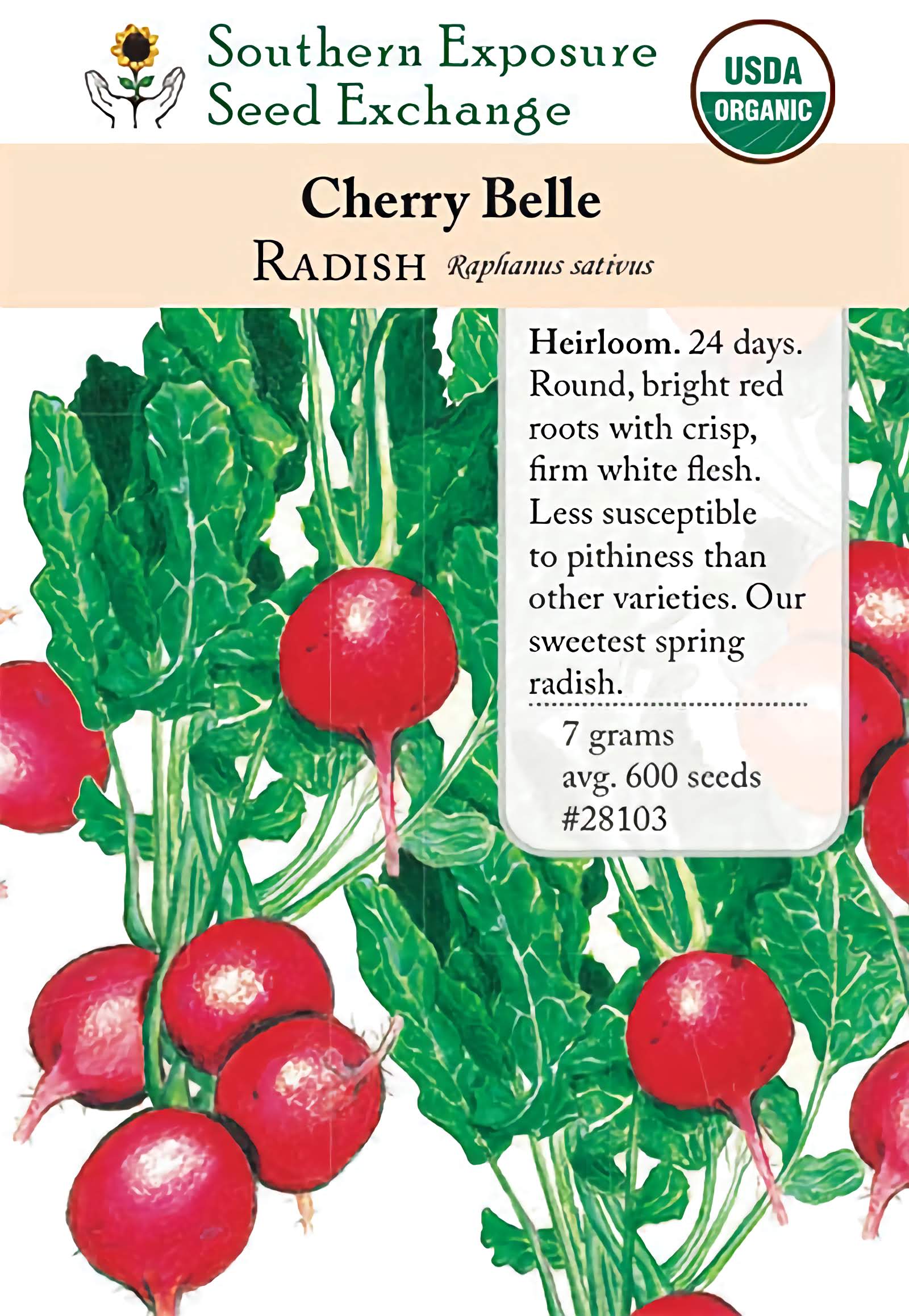 24 days. [1949, AAS winner.] Round roots, bright red skin, and firm white flesh. Somewhat less susceptible to developing pithiness compared to other varieties. Our sweetest spring radish.