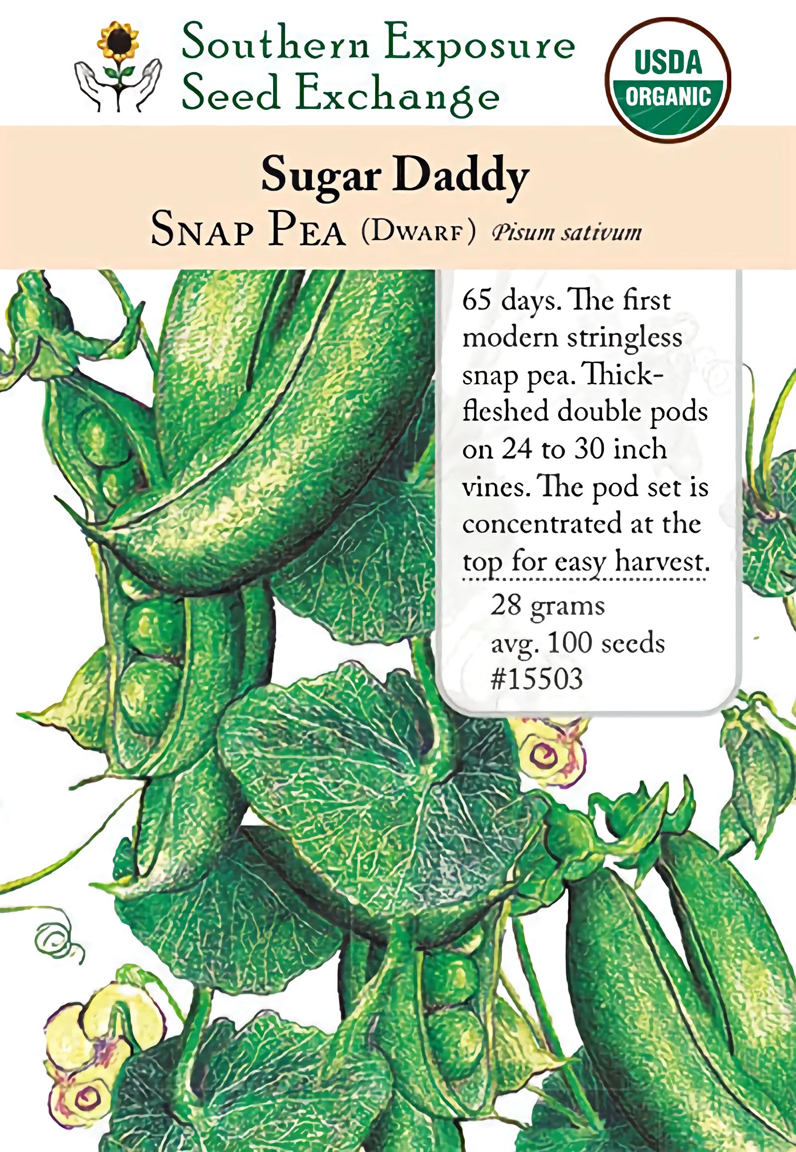 65 days. The first modern stringless snap pea to be developed, though not as flavorful as other snap peas. 24-30" vines with thick-fleshed double pods. Pod set is concentrated at the top for easy harvest.
