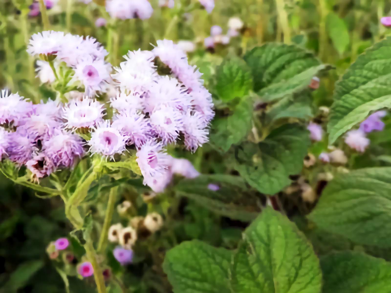 (Floss Flower, Bluemink) Ageratum houstonianum Prolific clusters of blue flowers. Long stems do well in bouquets, but may take root if allowed to rest on the ground. Native to Mexico. Self-sows.