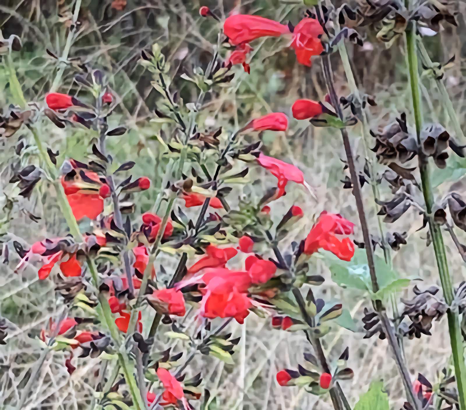 (Salvia coccinea) Native to the southern US. Spikes of red flowers that attract hummingbirds and butterflies from early summer until frost. Not a culinary type.