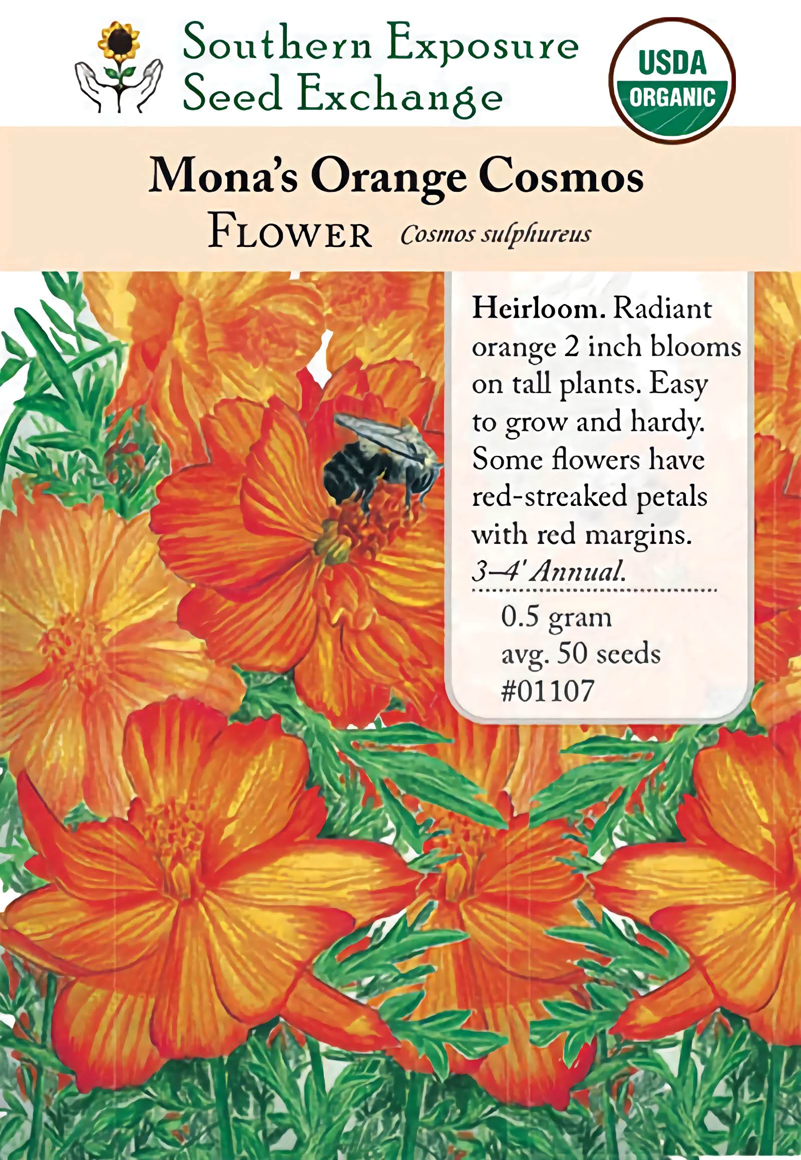 (Cosmos sulphureus) 59 days. [Introduced 1990 by SESE. Family heirloom from southern California.] Radiant orange, mostly single-petalled blooms, 2-2½ in. on 6-7 ft. plants. About 10% have red-bordered petals with some interior red streaks. Blooms all summer, very hardy.