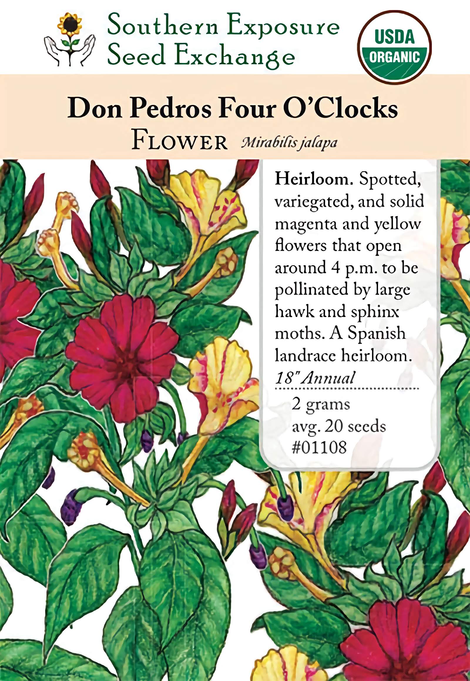 [Introduced 1982 by SESE. Our neighbor brought this heirloom back from her mother's home town in Spain where this flower is locally known as Don Pedros.] Unlike modern Four O'Clocks it has beautiful variegated flowers. Flowers are primarily magenta or yellow. On some plants both color types occur, on other plants the flowers are variegated striped or spotted. Flowers open about 4:00 in the afternoon and in the evening are pollinated by large hawkmoths and sphinx moths. Ht. 18"