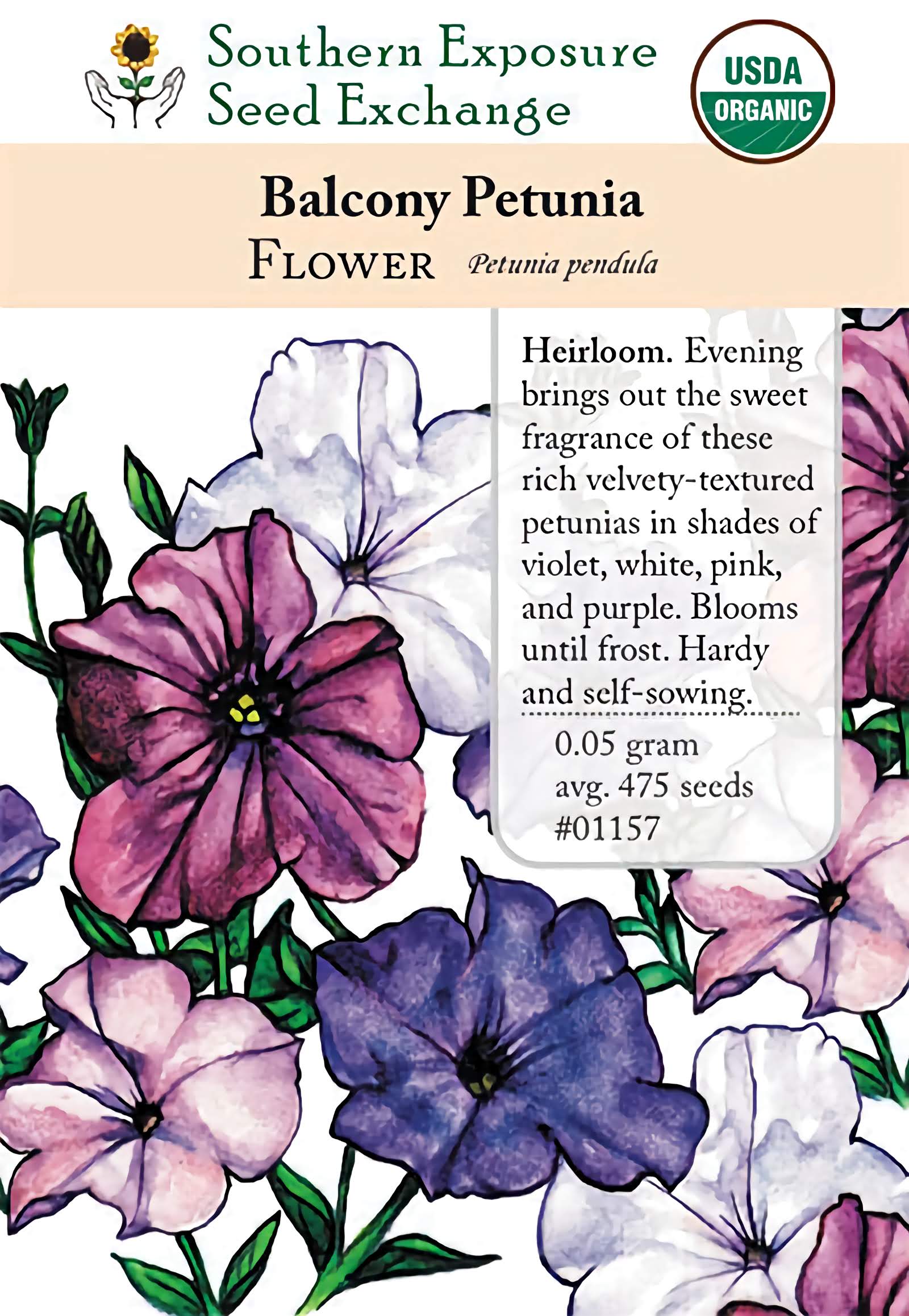 (Petunia pendula) Heirloom described in 1934 as the most showy of all petunias. Evening brings out the sweet fragrance of these rich velvety textured flowers in shades of violet, white, pink, and purple. Plants bloom until frost. Hardy and self-sowing.