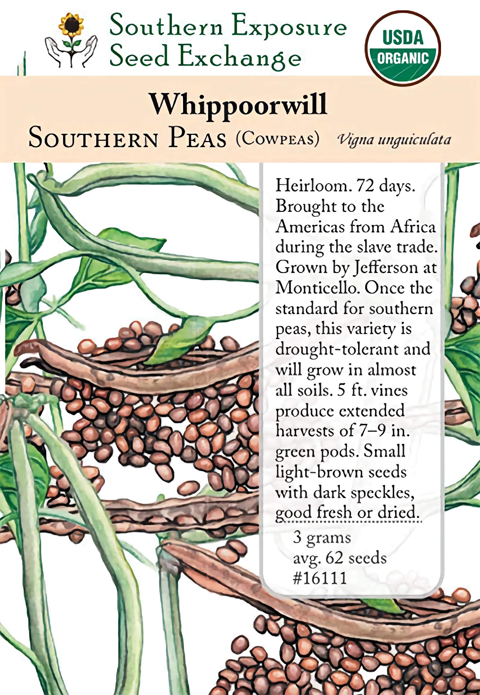72 days. [Brought to the Americas from Africa during the slave trade. Grown at Thomas Jefferson's Monticello.] Once the standard for southern peas, this variety is drought-tolerant and will grow in almost all soils. 5 ft. vines produce extended harvests of 7-9 in. green pods. Small seeds are light brown with dark speckles, good eaten green or dried.