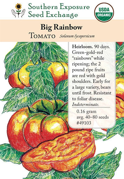 90 days. (ab, asc) (Indeterminate) [Introduced 1990 by SESE from Polk Co., MN.] The most visually spectacular tomato we've grown. As fruits ripen they resemble a rainbow: green on the shoulder, yellow in the middle, and red on the bottom. Fully ripe fruits are gold on the stem end and red on the blossom end. Early fruits weigh over 2 lbs. with little catfacing or deformities. Very good resistance to foliar disease. Bears until frost.